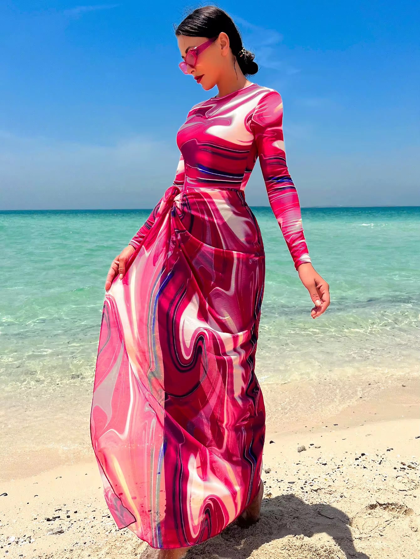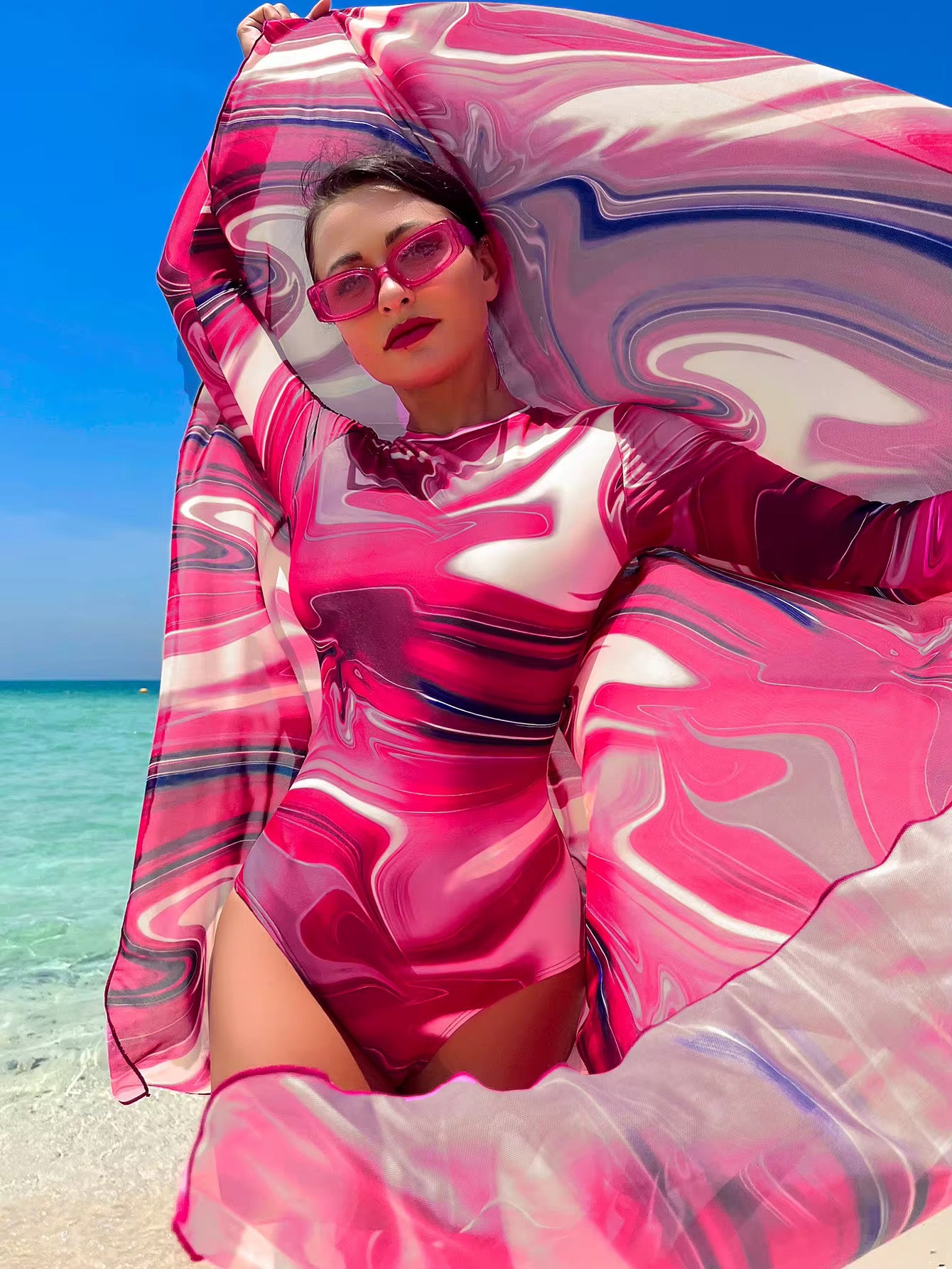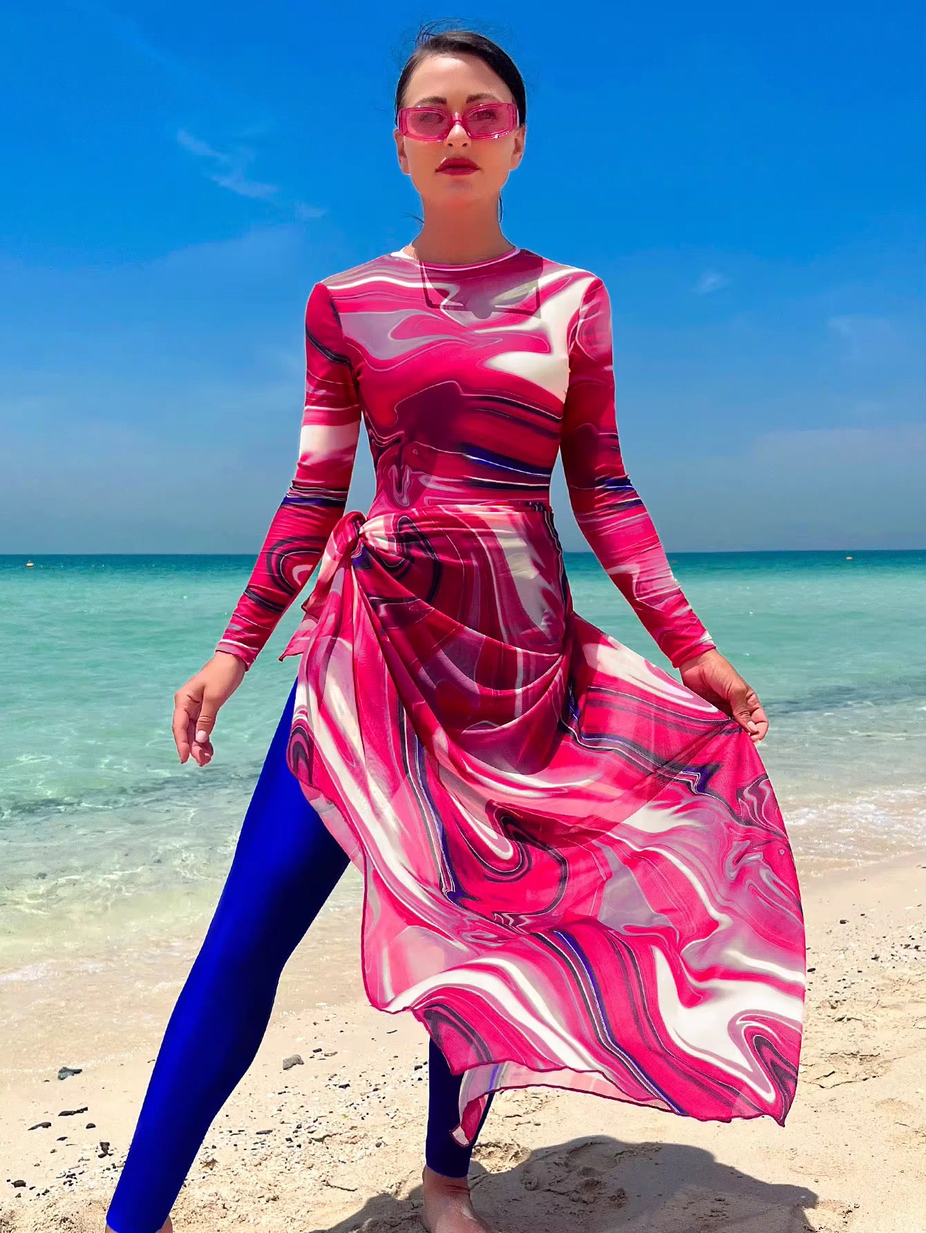 A striking fuchsia, blue, and white abstract print 3-piece swimwear set that balances bold style with effortless elegance. The printed monokini offers a sleek and flattering silhouette, while the matching pants provide comfortable coverage for a chic, modest look. The coordinating sarong-style cover-up adds a breezy and sophisticated touch, allowing you to transition seamlessly from poolside relaxation to resort-ready glamour. Perfect for beach vacations, luxurious getaways, and sunset strolls, this set is designed to make a statement while keeping you stylishly covered.