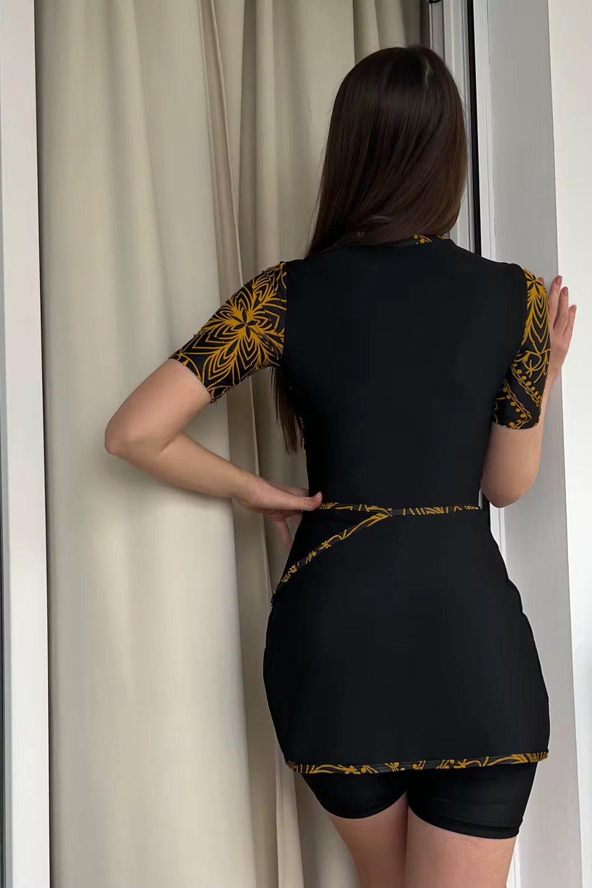 A sleek black-and-gold 3-piece modest swimwear set that blends sophistication with functional design. The high-neck zip-front swimsuit offers secure comfort and a chic silhouette, enhanced by intricate golden accents. Coordinated swim shorts provide confident coverage, while the asymmetrical wrap-style skirt adds a polished, versatile layer. Perfect for those who prefer modest elegance without compromising on style, this set transitions seamlessly from beach activities to relaxed resort lounging.