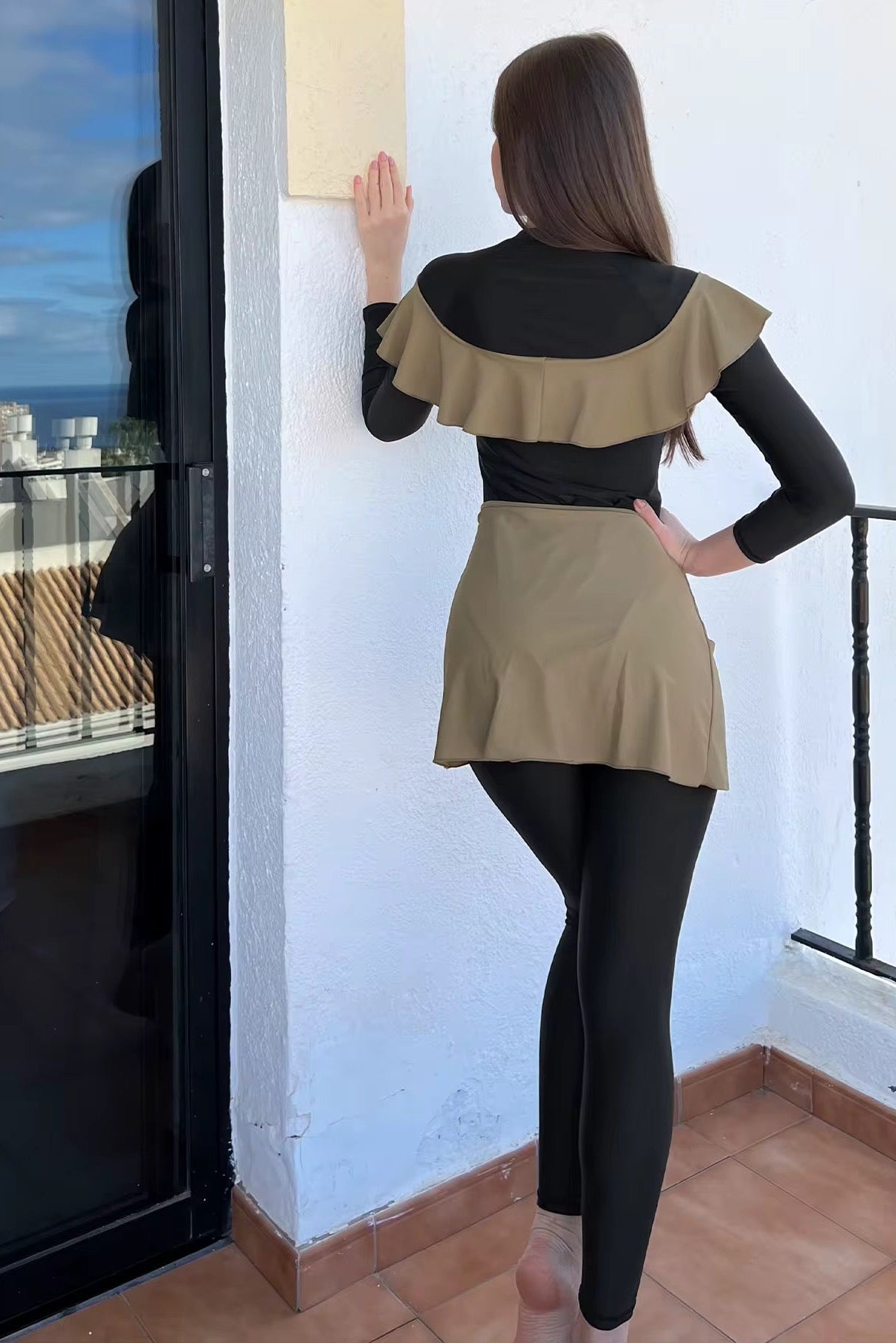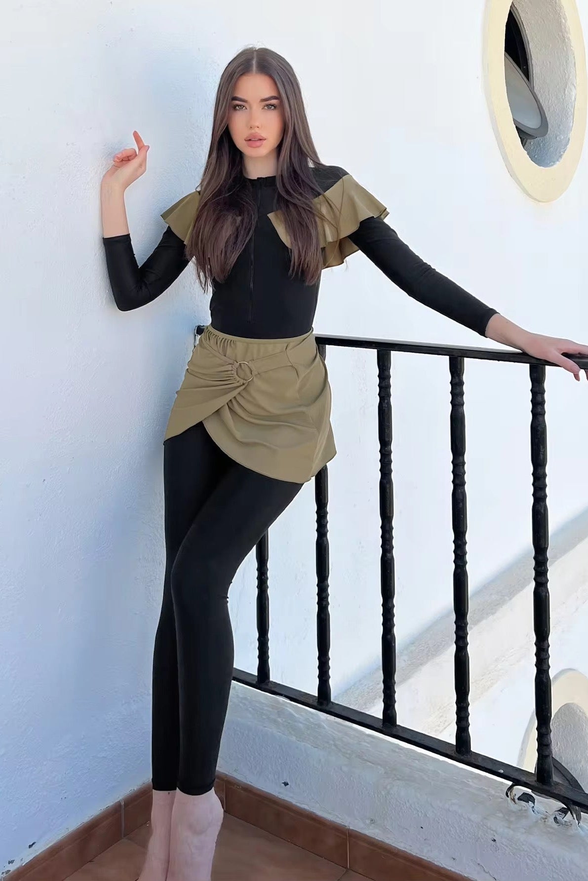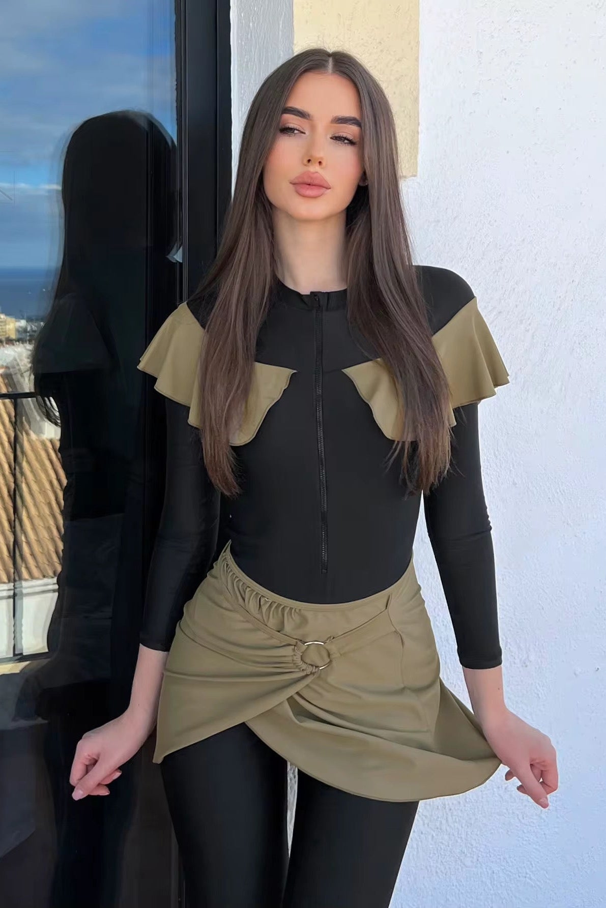A chic black-and-olive 3-piece modest swimwear set that redefines resort elegance with a contemporary edge. The sleek black bodysuit, detailed with a zip-front closure, offers both coverage and style, while dramatic layered shoulder panels add a playful yet sophisticated flair. Streamlined leggings ensure comfort and ease of movement, paired with a ruched olive wrap-style skirt that adds texture and polish. This versatile set is ideal for those who desire modesty without compromising on modern glamour—perfect for seaside getaways, luxe poolside lounging, or sunset walks.